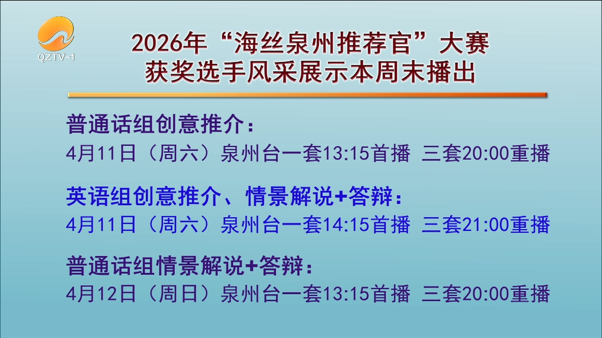 2026年“海丝泉州推荐官”大赛于3月27日圆满落幕。金银铜奖获奖选手在总决赛的精彩表现将于本周末在泉州广播电视台播出。其中普通话组创意推介于4月11日(周六)下午1:15在泉州台一套首播,晚上8:00在三套重播;英语组创意推介和情景解说+答辩于4月11日(周六)下午2:15在泉州台一套首播,晚上9:00在三套重播;普通话组情景解说+答辩于4月12日(周日)下午1:15在泉州台一套首播,晚上8:00在三套重播,敬请关注。【↓点击下方观看视频↓】*视频版权所有,未经许可不得转载【无线泉州】一审:苏含雪【无线泉州】二审:王桂瑜【无线泉州】三审:欧阳可及 郑云涛